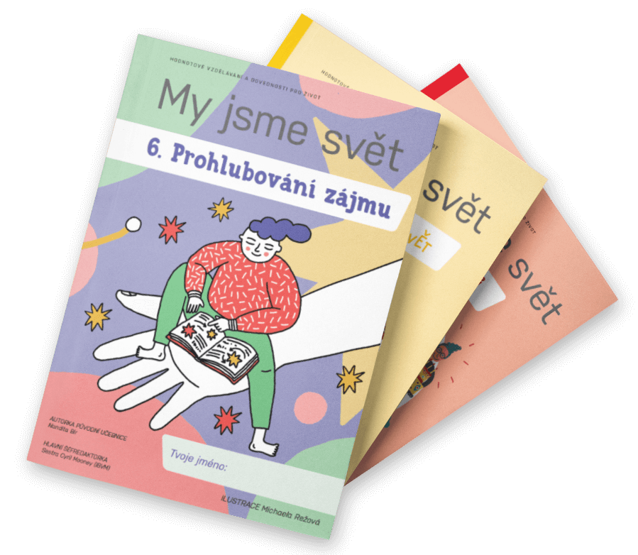 Učebnice MY JSME SVĚT jsou určeny pro děti od 1. třídy až po střední školu. Pro české děti jsme je adaptovali podle originálu, který se svým týmem vytvořila Cyril Mooney. Každý díl ilustroval jiný český výtvarník a je doplněn o sadu písní, které na témata v učebnicích složili české kapely a hudebníci.